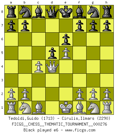 Last move : 0-1 2025 October 9 7:25:14 [Event "FICGS__CHESS__THEMATIC_TOURNAMENT__000276"] [Site "FICGS"] [Date "2025.09.01"] [Round "1"] [White "Tedoldi,Guido"] [Black "Cirulis,Ilmars"] [Result "0-1"] [WhiteElo "1713"] [BlackElo "2290"] 1.e4 c6 2.d4 d5 3.e5 c5 4.c4 cxd4 5.Qxd4 e6 6.Nc3 Nc6 7.Qd1 d4 8.Nce2 Nb4 9.a3 Qa5 10.Nf4 Nc2+ 11.Ke2 Qxe5+ 12.Kf3 Ne1+ 13.Kg3 Qg5+ 14.Qg4 Qxg4+ 15.Kxg4 Nf6+ 16.Kh4 g5+ 17.Kxg5 Be7 18.Bd2 Rg8+ 19.Kh4 Ne4 20.Kh5 Rg5+ 21.Kh4 f5 22.Rxe1 Rg4+ 23.Kh5 Rh4+ 0-1 Follow this game move after move (download)Mistrust is the most necessary characteristic of the Chess player. (Siegbert Tarrasch) Ich kenne keine einzige Person, die behaupten würde, Garri Kasparow sei ein guter Mensch (Nigel Short) Prefiero perder una partida realmente buena, que ganar una mala. (David Levy) Le joueur d'Echecs qui veut atteindre le top est obligé de développer son propre credo créatif. Alexeï Stepanovicth Souétine. Il est facile d'écrire des livres ! Ce qui est difficile, c'est de jouer ! (Alexeï Stepanovicth Souétine) Happy endings are just stories that haven't finished yet. (Jane Smith in Mr & Mrs Smith)