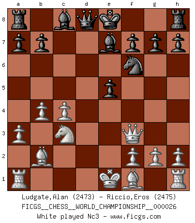 Last move : 1/2-1/2 2025 October 5 16:58:14 [Event "FICGS__CHESS__WORLD_CHAMPIONSHIP__000026"] [Site "FICGS"] [Date "2025.09.01"] [Round "6"] [White "Ludgate,Alan"] [Black "Riccio,Eros"] [Result "1/2-1/2"] [WhiteElo "2473"] [BlackElo "2475"] 1.c4 e6 2.d4 d5 3.Nf3 c6 4.e3 Nf6 5.b3 c5 6.Bb2 cxd4 7.Nxd4 e5 8.Nf3 Nc6 9.a3 d4 10.exd4 Nxd4 11.b4 Nxf3+ 12.Qxf3 Be7 13.Nc3 O-O 14.Be2 a5 15.Rd1 Qb6 16.b5 Bg4 17.Nd5 Nxd5 18.Qxg4 Nf6 19.Qg3 Rfe8 20.Bxe5 Qe6 21.O-O Bc5 22.Bxf6 Qxf6 23.Bf3 Re7 24.a4 Rae8 25.Bd5 g6 26.Qf3 Qxf3 27.Bxf3 Kg7 28.g3 b6 29.Kg2 1/2-1/2 Follow this game move after move (download)Bobby Fischer is the greatest Chess player who has ever lived. (Ken Smith) Unter Putin wird alles Geld aus Russland wie von einem Staubsauger nach Moskau umgeleitet, das ist wie ein schwarzes Loch. (Garry Kasparov) El Ajedrez expande y enriquece tu mente. (Saudin Robovic) Ne tendez aucun piège pour le plaisir ! Ne jouez rien dans l'espoir que l'adversaire réagisse de façon stupide ! Prenez toujours pour acquis que l'adversaire va trouver le meilleur coup ! Ne jouez jamais de coup dans l'espoir que l'adversaire ne voie pas la menace ! Chacun de vos coups doit améliorer la position d'une façon ou d'une autre. There are two kinds of tragedy in this world, one is not getting what you want and the other is getting. (Lord of war)