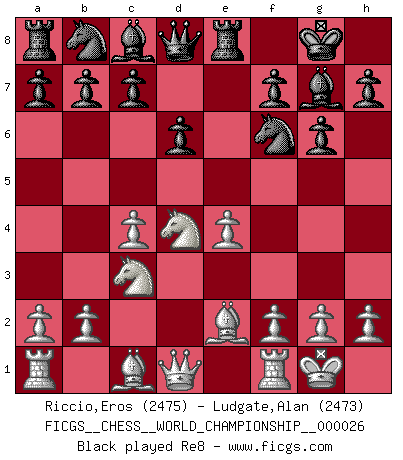 Last move : 1/2-1/2 2025 October 24 4:29:55 [Event "FICGS__CHESS__WORLD_CHAMPIONSHIP__000026"] [Site "FICGS"] [Date "2025.09.01"] [Round "9"] [White "Riccio,Eros"] [Black "Ludgate,Alan"] [Result "1/2-1/2"] [WhiteElo "2475"] [BlackElo "2473"] 1.d4 Nf6 2.c4 g6 3.Nc3 Bg7 4.e4 d6 5.Nf3 O-O 6.Be2 e5 7.O-O exd4 8.Nxd4 Re8 9.f3 Nc6 10.Be3 Nh5 11.Nc2 Be5 12.g3 f5 13.Nd5 Bxb2 14.Rb1 Bg7 15.g4 f4 16.Bf2 Nf6 17.Nxf4 Nd7 18.h4 Nc5 19.Kg2 Rb8 20.Qd2 Ne6 21.Nxe6 Bxe6 22.Rh1 Qf6 23.Nb4 Nxb4 24.Rxb4 Rf8 25.Be3 Qf7 26.h5 a5 27.R4b1 Bxc4 28.Bxc4 Qxc4 29.hxg6 hxg6 30.Bh6 Qf7 31.Rh3 Bxh6 32.Qxh6 Qxa2+ 33.Kg3 Rxf3+ 34.Kxf3 Rf8+ 35.Ke3 Qa3+ 36.Ke2 Qa2+ 37.Ke3 Qa3+ 38.Ke2 Qa2+ 39.Ke3 Qa3+ 1/2-1/2 Follow this game move after move (download)I believe that Chess possesses a magic that is also a help in advanced age. A rheumatic knee is forgotten during a game of Chess and other events can seem quite unimportant in comparison with a catastrophe on the chessboard. (Vlastimil Hort) Frage: Gibt es etwas was Sie mehr lieben als Autobahnen ohne Tempobegrenzungen? - Antwort: Deutsche Frauen ohne Tempobegrenzungen. (Loek van Wely) Jugadores de primera clase pierden en contra de jugadores de segunda clase porque los jugadores de segunda clase a veces juegan una partida de primer clase. (Siegbert Tarrasch) Vouloir jouer aux échecs contre soi-même est aussi paradoxal que vouloir marcher sur son ombre. (Stefan Zweig) Coffee just isn't my cup of tea. (Unknown)