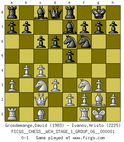 Last move : 0-1 2006 October 21 0:57:11 [Event "FICGS__CHESS__WCH_STAGE_1_GROUP_06__000001"] [Site "FICGS"] [Date "2006.07.01"] [Round "1"] [White "Grosdemange,David"] [Black "Ivanov,Hristo"] [Result "0-1"] [WhiteElo "1983"] [BlackElo "2225"] 1.a3 e5 2.c4 Nf6 3.d3 c6 4.Nf3 Be7 5.g3 O-O 6.Bg2 d6 7.O-O Nbd7 8.Nc3 Re8 9.Qc2 Nf8 10.b4 Ne6 0-1 This chess game has been lost on time (started : 2006.07.01 16:7:34) Anderssen's Opening Kingside Castling by player Black (move 5) Kingside Castling by player White (move 7) Player Black won this chess game. Follow this game move after move (download)Not all artists are Chess players, but all Chess players are artists. (Marcel Duchamp) Ich glaube nicht an Psychologie, ich glaube an gute Züge. (Robert James Fischer) No existe un remordimiento como el remordimiento del Ajedrez. (H. G. Wells) Aucun coup ne doit être joué sans but. (Pedro Damiano) There are two major products that came out of Berkeley: LSD and UNIX. We do not believe this is to be a coincidence. (Jeremy S. Anderson)