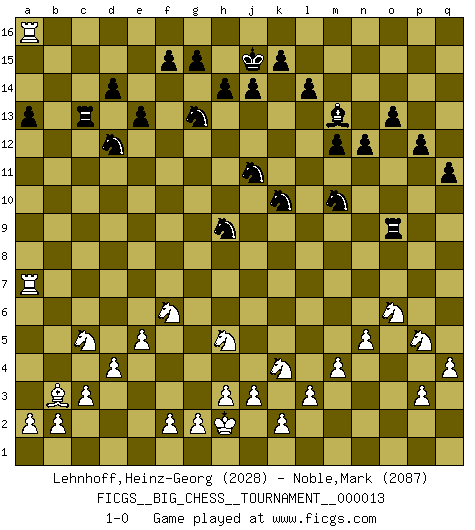 Last move : 1-0 2008 March 23 19:47:6 [Event "FICGS__BIG_CHESS__TOURNAMENT__000013"] [Site "FICGS"] [Date "2007.10.07"] [Round "1"] [White "Lehnhoff,Heinz-Georg"] [Black "Noble,Mark"] [Result "1-0"] [WhiteElo "2028"] [BlackElo "2087"] 1.j2-k4 m15-m13 2.h1-o7 h15-g13 3.o7-l7 j15-k13 4.l7-c15 h16-o10 5.h2-g4 o10-o2 6.m2-m4 o2-o13 7.e2-e4 e15-e13 8.c15-c10 k16-h15 9.p1-q3 b16-c14 10.n2-n4 f16-b12 11.o1-m3 n15-n13 12.d2-d4 o16-f8 13.g1-j2 l16-n14 14.f1-d3 p16-n15 15.q1-o1 o13-p12 16.q3-p5 d15-d14 17.q2-q3 c16-h11 18.c10-h5 p12-h5 19.k4-h5 a16-c16 20.l1-m2 c14-d12 21.o1-o8 f8-m2 22.k1-m2 o15-o13 23.c2-c3 q16-o16 24.e4-e5 e16-e14 25.c1-p13 m16-m15 26.m2-k3 p15-p14 27.b1-d2 g16-j15 28.j1-h2 c16-c13 29.m1-o1 j15-h13 30.d3-h7 j16-j15 31.o1-o6 o16-c16 32.d2-e4 h15-j13 33.e4-c5 j13-l12 34.o6-b6 a15-a13 35.e1-o1 n13-n12 36.o1-o6 n15-l14 37.a1-o1 l14-m12 38.h7-f9 h11-f9 39.m3-f9 m12-o11 40.p13-h6 b12-h6 41.o6-h6 h13-g11 42.f9-a4 l15-l14 43.b6-b15 e14-f14 44.o8-b8 m15-m16 45.o1-o7 f14-f10 46.h6-g6 g11-h9 47.g6-g10 f10-g10 48.a4-g10 k13-j11 49.g10-a4 m13-m12 50.a4-b3 l12-k10 51.g4-f6 m16-m13 52.j2-k4 m13-l13 53.l2-l3 l13-l9 54.n4-n5 q15-q13 55.q3-q4 q13-q12 56.k3-l5 p14-p13 57.l5-m7 l9-q9 58.p2-p3 p13-p12 59.m7-o6 q12-q11 60.o7-a7 o11-m10 61.b15-b16 c16-b16 62.b8-b16 q9-o9 63.b16-n16 n14-m13 64.n16-a16 1-0 Follow this game move after move (download)All I want to do, ever, is just play Chess. (Bobby Fischer) Mutter, ich bin eben Ex-Weltmeister geworden. --beim nach Hause Kommen nach dem Verlust des WM-Titels an Mihail Botvinnik -- (Mikhail Nekhemyevich Tal) Es el objetivo de la escuela moderna no tratar cada posición de acuerdo a una regla general, sino de acuerdo al principio inherente en la posición. (Richard Reti) Une platitude souvent récitée à propos des Echecs est qu'une des choses les plus difficiles à réaliser est de gagner une position gagnante. Cela ne manque pas de sens mais, pour ma part, j'ai toujours trouvé plus difficile de gagner une position perdante. (Tim Krabbe) The only thing that overcomes hard luck is hard work. (Harry Golden)