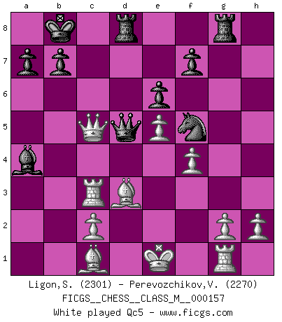 Last move : 1/2-1/2 2025 December 20 20:9:3 [Event "FICGS__CHESS__CLASS_M__000157"] [Site "FICGS"] [Date "2025.09.01"] [Round "1"] [White "Ligon,Scott"] [Black "Perevozchikov,Vjacheslav"] [Result "1/2-1/2"] [WhiteElo "2301"] [BlackElo "2270"] 1.e4 e6 2.d4 d5 3.Nc3 Bb4 4.e5 c5 5.a3 Bxc3+ 6.bxc3 Ne7 7.Qg4 Qc7 8.Qxg7 Rg8 9.Qxh7 cxd4 10.Ne2 dxc3 11.f4 Nbc6 12.Qd3 d4 13.Nxd4 Nxd4 14.Qxd4 Bd7 15.Rg1 Nf5 16.Qf2 Qc6 17.Bd3 Qd5 18.a4 O-O-O 19.Ra3 Kb8 20.Rxc3 Bxa4 21.Qc5 Qd7 22.Qb4 Bc6 23.g3 Nd4 24.Kf2 Qd5 25.Bf1 Nxc2 26.Qc4 Rc8 27.h4 a5 28.h5 a4 29.Be2 b5 30.Qc5 Nd4 31.Qb6+ Bb7 32.Rd3 Rxc1 33.Rxd4 Qc5 34.Qxc5 Rxc5 35.g4 a3 36.g5 a2 37.Rd2 Bd5 38.Bf3 Bb3 39.Ra1 b4 40.h6 Kc7 41.R1xa2 Bxa2 42.Rxa2 Kb6 43.Rb2 Ka5 44.Ra2+ Kb6 45.Rb2 Ka5 46.Ra2+ 1/2-1/2 Follow this game move after move (download)By playing at Chess then, we may learn: First: Foresight... Second: Circumspection... Third: Caution... And lastly, we learn by Chess the habit of not being discouraged by present bad appearances in the state of our affairs, the habit of hoping for a favorable chance, and that of persevering in the secrets of resources. (Benjamin Franklin) Der zweitbeste Zug ist oft der einzig richtige. (Savielly Grigorievitsch Tartakower) Si tu oponente te ofrece un empate, trata de averiguar porque piensa él que esta en una posición peor. (Nigel Short) Si rien de grave n'est détecté lors de l'analyse d'une position, on joue alors le coup. Seconde règle de Blumenfeld. Luck never made a man wise. (Seneca, Letters to Lucilius)