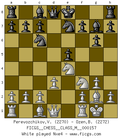 Last move : 1/2-1/2 2025 November 27 16:8:2 [Event "FICGS__CHESS__CLASS_M__000157"] [Site "FICGS"] [Date "2025.09.01"] [Round "1"] [White "Perevozchikov,Vjacheslav"] [Black "Ozen,Bahadir"] [Result "1/2-1/2"] [WhiteElo "2270"] [BlackElo "2272"] 1.Nf3 d5 2.g3 g6 3.Bg2 Bg7 4.O-O e5 5.d3 Nc6 6.Nc3 Nge7 7.e4 dxe4 8.Nxe4 O-O 9.Re1 f5 10.Ned2 Be6 11.d4 e4 12.Ng5 Nxd4 13.c3 h6 14.Nxe6 Nxe6 15.f3 Nc6 16.fxe4 f4 17.Qb3 Qe7 18.gxf4 Kh7 19.Nf3 Nxf4 20.Bxf4 Rxf4 21.Qxb7 Qc5+ 22.Kh1 Raf8 23.Rf1 Ne5 1/2-1/2 Follow this game move after move (download)There must have been a time when men were demigods, or they could not have invented Chess. (Gustav Schenk) Habe Mut, dich deines eigenen Verstandes zu bedienen. (Immanuel Kant) Buenas posiciones no logran ganar juegos, buenas movidas sí. (Gerald Abrahams) Que feriez-vous si vous étiez en train de jouer aux échecs et que la fin du monde arrive ? Je continuerais à jouer. (Saint Borromée) 98% of all statistics are made up. (Author unknown)