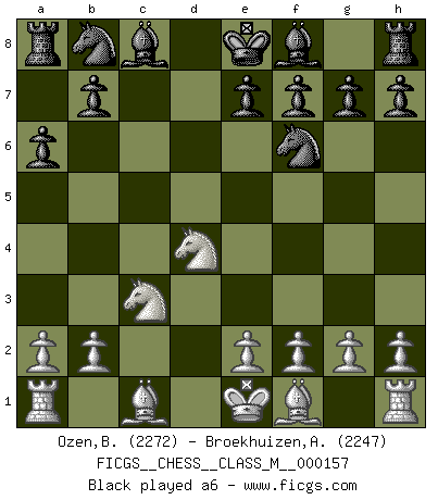 Last move : 1/2-1/2 2025 November 27 10:57:46 [Event "FICGS__CHESS__CLASS_M__000157"] [Site "FICGS"] [Date "2025.09.01"] [Round "1"] [White "Ozen,Bahadir"] [Black "Broekhuizen,A. T. S."] [Result "1/2-1/2"] [WhiteElo "2272"] [BlackElo "2247"] 1.d4 Nf6 2.Nf3 d5 3.c4 c5 4.cxd5 cxd4 5.Qxd4 Qxd5 6.Nc3 Qxd4 7.Nxd4 a6 8.g3 e5 9.Nb3 Nc6 10.Bg2 a5 11.Na4 Bb4+ 12.Bd2 Ke7 13.O-O Bxd2 14.Nxd2 Rd8 15.Rfd1 Bg4 16.Nb3 Bxe2 17.Re1 Bb5 18.Nc3 Bc4 19.Nc5 Ra7 20.Bxc6 bxc6 21.Rxe5+ 1/2-1/2 Follow this game move after move (download)Help your pieces so they can help you. (Paul Morphy) Je mehr ich von der FIDE weiss, um so weniger verstehe ich. (Alexander Kalifman) De eso se trata el Ajedrez. Un día le das una lección a tu oponente y al día siguiente el te da una a tí. (Bobby Fischer) Demandez au pauvre Cg1 ce qu'il en pense. Eduard Gufeld à propos de la variante Saemisch de l'Est-Indienne. Life is like a game of cards: the hand you are dealt represents determinism; the way you play it is free will. (Jawaharlal Nehru)