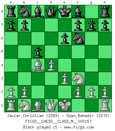 Last move : 1/2-1/2 2025 October 23 4:45:14 [Event "FICGS__CHESS__CLASS_M__000157"] [Site "FICGS"] [Date "2025.09.01"] [Round "1"] [White "Javier,Christian"] [Black "Ozen,Bahadir"] [Result "1/2-1/2"] [WhiteElo "2283"] [BlackElo "2272"] 1.d4 d5 2.Nf3 Nf6 3.c4 dxc4 4.e3 e6 5.Bxc4 c5 6.O-O a6 7.b3 cxd4 8.Nxd4 Be7 9.Bb2 O-O 10.Be2 Bd7 11.Nd2 Nc6 12.Bf3 Rc8 13.Nc4 b5 14.Nxc6 Bxc6 15.Qxd8 Rfxd8 16.Nb6 Rb8 17.Bxc6 Rxb6 18.Rfc1 R6b8 19.Bf3 Nd5 20.g3 Nb4 1/2-1/2 Follow this game move after move (download)That's what Chess is all about. One day you give your opponent a lesson, the next day he gives you one. (Bobby Fischer) Schach ist ein schwarz-weisser Dschungel. (Garry Kasparov) Tu cuerpo tiene que estar en óptima condición. Tu Ajedrez se deteriora como lo hace tu cuerpo. No puedes separar la mente y el cuerpo. (Bobby Fischer) Il a essayé de se convaincre qu'il pourrait empêcher toutes les erreurs et ne jamais perdre. L'horreur ! Gary Kasparov au sujet de Robert Fischer. A woman without a man is like a fish without a bicycle. (Gloria Steinem)