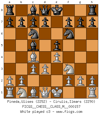 Last move : 1/2-1/2 2025 November 24 21:24:16 [Event "FICGS__CHESS__CLASS_M__000157"] [Site "FICGS"] [Date "2025.09.01"] [Round "1"] [White "Pineda,Ulises"] [Black "Cirulis,Ilmars"] [Result "1/2-1/2"] [WhiteElo "2252"] [BlackElo "2290"] 1.e4 e5 2.Nf3 Nc6 3.Bc4 Bc5 4.d3 Nf6 5.c3 O-O 6.O-O d5 7.exd5 Nxd5 8.Re1 Bg4 9.Nbd2 Nb6 10.h3 Bh5 11.Bb3 Qxd3 12.Nxe5 Qf5 13.Nef3 Rad8 14.Qe2 Qc8 15.Ne4 Rfe8 16.Bf4 Na5 17.Bc2 Nac4 18.a4 a5 19.b4 Bf8 20.bxa5 Nxa5 21.g4 Bg6 22.Ne5 Nd5 23.Nxg6 hxg6 24.Qf3 Nxf4 25.Qxf4 Bd6 26.Qf3 Qe6 27.Re2 Qe5 28.Rae1 Qh2+ 29.Kf1 Rf8 30.Qg2 Qxg2+ 31.Kxg2 Bf4 32.h4 b6 33.Kf3 Be5 34.Kg2 Bf4 35.Kf3 Be5 36.Bb1 Nc4 37.Ba2 1/2-1/2 Follow this game move after move (download)Chess is the gymnasium of the mind. (Blaise Pascal) Kasparov ist eine Art Monster mit hundert Augen, denen auch nicht das Geringste entgeht. (Tony Miles) Una de estas pequeñas movidas modestas pudieran ser mas molestas a tu oponente que la amenaza mas grande. (Siegbert Tarrasch) Le système Elo représente seulement une moyenne. Il est simplement un indicateur de votre stabilité. (Anatoli Karpov) If everyone is thinking alike, then somebody isn't thinking. (US General George S. Patton)