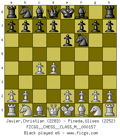 Last move : 1/2-1/2 2025 December 2 16:14:35 [Event "FICGS__CHESS__CLASS_M__000157"] [Site "FICGS"] [Date "2025.09.01"] [Round "1"] [White "Javier,Christian"] [Black "Pineda,Ulises"] [Result "1/2-1/2"] [WhiteElo "2283"] [BlackElo "2252"] 1.d4 Nf6 2.c4 e6 3.Nf3 d5 4.Nc3 Be7 5.Bf4 c5 6.dxc5 Bxc5 7.e3 O-O 8.a3 dxc4 9.Qc2 a6 10.Bxc4 b5 11.Bd3 Bb7 12.O-O Nbd7 13.Rfd1 h6 14.Ne5 Rc8 15.Nxd7 Nxd7 16.Bh7+ Kh8 17.Be4 Bxe4 18.Qxe4 Qe7 19.Qb7 Nb8 20.Qf3 b4 21.axb4 Bxb4 22.Na2 Bc5 23.Nc3 Bb4 24.Bxb8 Rxb8 25.Rxa6 Qc7 26.Rc6 Qb7 27.Rc1 Be7 28.Na4 Bf6 29.Nc5 Qa7 1/2-1/2 Follow this game move after move (download)Of Chess it has been said that life is not long enough for it, but that is the fault of life, not Chess. (William Ewart Napier) Ich kenne Menschen, die allen Willen der Welt besitzen und doch nicht Schach spielen können. (Robert James Fischer) En manos de Fischer's, una diminuta ventaja teórica es tan buena como tener una Reina de ventaja. (Isaac Kashdan) Votre prénom est 'Tactique', votre deuxième prénom est 'Tactique' et votre nom est 'Tactique'. (Ken Smith) We're missing something. (Gregory House, House M.D.)