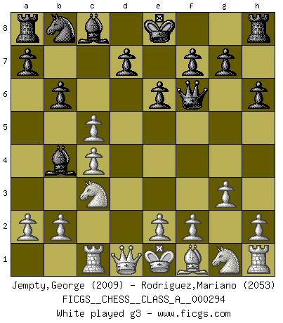 Last move : 1/2-1/2 2025 October 30 7:49:58 [Event "FICGS__CHESS__CLASS_A__000294"] [Site "FICGS"] [Date "2025.09.04"] [Round "1"] [White "Jempty,George"] [Black "Rodriguez,Mariano"] [Result "1/2-1/2"] [WhiteElo "2009"] [BlackElo "2053"] 1.d4 Nf6 2.c4 e6 3.Bg5 h6 4.Bxf6 Qxf6 5.Nc3 Bb4 6.Rc1 c5 7.dxc5 b6 8.g3 bxc5 9.Bg2 Nc6 10.Bxc6 dxc6 11.Qd6 e5 12.Qxf6 gxf6 13.Nf3 Ke7 14.O-O Rd8 15.Na4 e4 16.Nh4 Rd2 17.a3 Ba5 18.e3 Bh3 19.Rfd1 Rad8 20.Rxd2 Rxd2 21.Nxc5 Rxb2 22.Nxe4 Ra2 23.Nf3 Rxa3 24.Nd4 f5 25.Nxc6+ Kd7 26.Nxa5 fxe4 27.Nb7 a5 28.Nc5+ Kc6 29.Nxe4 a4 30.Nc3 Kc5 31.f3 Bd7 32.Kf2 Rb3 33.Nxa4+ Bxa4 1/2-1/2 Follow this game move after move (download)The combination player thinks forward; he starts from the given position, and tries the forceful moves in his mind. (Emanuel Lasker) Mit sehr nachdenklichem Gesicht schreitet Bobby durch den Turniersaal. Was ist passiert?, fragt Lombardy. Ich stehe schlecht, antwortet Fischer. Lombardy: Dann biete doch einfach Remis an. Fischer: So schlecht stehe ich nun auch wieder nicht! (Robert James Fischer) Cuando le juegas a Fischer, no es una cuestion de si vas a ganar o perder. Es una cuestion de si vas a sobrevivir. (Boris Spassky) Tous ces prétendus hommes politiques sont les pions, les Cavaliers, les Tours ou les Fous d'une partie d'échecs qui se jouera tant qu'un hasard ne renversera pas l'échiquier. (Honoré de Balzac) Being number two sucks. (Andre Agassi)