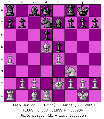 Last move : 1/2-1/2 2025 September 19 13:51:21 [Event "FICGS__CHESS__CLASS_A__000294"] [Site "FICGS"] [Date "2025.09.04"] [Round "1"] [White "Cleto Junior,Dirceu"] [Black "Jempty,George"] [Result "1/2-1/2"] [WhiteElo "2111"] [BlackElo "2009"] 1.e4 e5 2.Nf3 Nc6 3.Bc4 d6 4.d4 Nf6 5.d5 Nb8 6.Nc3 Be7 7.a4 O-O 8.Qe2 c6 9.O-O cxd5 10.Nxd5 Nxd5 11.Bxd5 Nd7 12.Rd1 Qc7 13.h3 Nf6 14.Bb3 Be6 15.Bg5 Rac8 16.Ra3 h6 17.Bxf6 Bxf6 18.c3 Qd7 19.a5 a6 20.Ne1 Bxb3 21.Rxb3 Rc5 22.Ra3 Bd8 23.Nc2 Rxa5 24.Rxa5 Bxa5 25.Ne3 Bc7 26.h4 1/2-1/2 Follow this game move after move (download)I am the best player in the world and I am here to prove it. (Bobby Fischer) Obendrein hat der FIDE-Präsident den Revolutionsführer Gaddafi zum »Großmeister« ernannt, am Ende der WM. Das ist lächerlich! (Joel Lautier) Todo se encuentra en un estado de flujo y esto incluye al mundo del Ajedrez. (Mikhail Botvinnik) Roi des jeux et jeu des rois, les échecs portent en eux un sentiment d'infini. Ils donnent à celui qui s'est efforcé d'en approfondir les arcanes l'impression de n'être pas à la mesure de l'homme; en fait, ils constituent un résumé de l'univers, un microcosme, et figurent cette grande échelle qui, dans les plans de la lumière descend jusqu'à la matière, qui des abîmes insondables remonte jusqu'en l'infini de Dieu. (Pyrame) It is a good thing for an uneducated man to read books of quotations. (Winston Churchill)