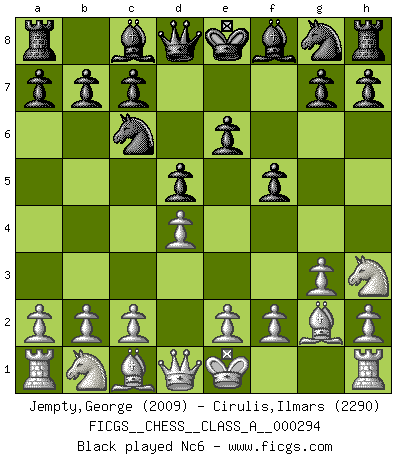 Last move : 1/2-1/2 2025 October 5 1:28:5 [Event "FICGS__CHESS__CLASS_A__000294"] [Site "FICGS"] [Date "2025.09.04"] [Round "1"] [White "Jempty,George"] [Black "Cirulis,Ilmars"] [Result "1/2-1/2"] [WhiteElo "2009"] [BlackElo "2290"] 1.d4 f5 2.Nh3 e6 3.g3 d5 4.Bg2 Nc6 5.Bg5 Nf6 6.Nf4 h6 7.Ng6 Rg8 8.Bf4 Bd6 9.c4 dxc4 10.Bxc6+ bxc6 11.Qa4 Rb8 12.Nd2 Kf7 13.Ne5+ Bxe5 14.Bxe5 Qd5 15.f3 c5 16.b3 c3 17.Nc4 cxd4 18.O-O-O Bd7 19.Qxa7 Ra8 20.Qxd4 Rxa2 21.Bxf6 gxf6 22.Qxc3 Qb5 23.Rd2 Ra6 24.Rhd1 Bc6 25.Rd8 Rxd8 26.Rxd8 Qc5 27.Qd4 1/2-1/2 Comment by player 1 : George Jempty : It appears that 2...e6 IS the correct response to 2.Nh3, though with some new hardware I bought in Sept 2025, I can easily double check with SF17 to very deep depths. All things considered I am happy with this variation as White. Knowing in mind beforehand that 2.Nh3 was an offbeat, sharp, and quite sound line, helped me decide to switch to 1.d4 for the first time in my half-century of tournament chess! Comment by player 2 : Ilmars Cirulis : Yes, 2.Nh3 is good move. :) (Sorry, I missed this comment for such a long time.) George Jempty Actually, now that I think about it, I did previously play 1.d4, I vaguely remember a game where I faced the Budapest, back when I was 14 or 15 years old, *almost* fifty ago! Follow this game move after move (download)When asked, -How is that you pick better moves than your opponents?, I responded: I'm very glad you asked me that, because, as it happens, there is a very simple answer. I think up my own moves, and I make my opponent think up his. (Alexander Alekhine) Modernes Schach sorgt sich zuviel um Dinge wie Bauernstruktur usw. Vergessen Sie das, Schachmatt beendet das Spiel! (Nigel Short) Después de la respuesta de las negras a 1.e4 con 1..e5, se quedan siempre tratando de entrar dentro del juego. (Howard Staunton) Tout change constamment, y compris dans le monde des Echecs. (Botvinnik) Nothing is more important for teaching us to understand the concepts we have than constructing fictitious ones. (Ludwig Wittgenstein)