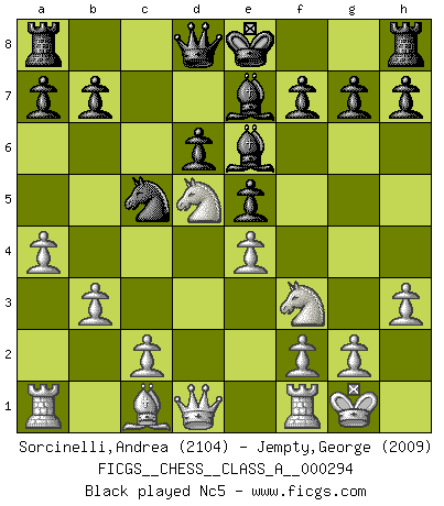 Last move : 1/2-1/2 2025 September 18 22:39:54 [Event "FICGS__CHESS__CLASS_A__000294"] [Site "FICGS"] [Date "2025.09.04"] [Round "1"] [White "Sorcinelli,Andrea"] [Black "Jempty,George"] [Result "1/2-1/2"] [WhiteElo "2104"] [BlackElo "2009"] 1.e4 e5 2.Nf3 Nc6 3.Bc4 d6 4.d4 Nf6 5.d5 Nb8 6.Nc3 Be7 7.h3 c6 8.a4 cxd5 9.Bxd5 Nxd5 10.Nxd5 Be6 11.O-O Nd7 12.b3 Nc5 13.Re1 O-O 14.Ba3 Rc8 15.Re3 Bxd5 16.Qxd5 Qb6 17.Bxc5 Qxc5 18.Qxc5 Rxc5 19.c4 Rc6 20.Ne1 f5 21.exf5 Rxf5 22.Rd1 Bd8 23.Re2 Bb6 24.Rd5 Rf8 25.Nf3 Bc5 26.Nd2 Rb6 27.Rd3 a6 28.Ne4 Bd4 29.Ng5 Rf6 30.Nf3 1/2-1/2 Follow this game move after move (download)After a bad opening, there is hope for the middle game. After a bad middle game, there is hope for the endgame. But once you are in the endgame, the moment of truth has arrived. (Edmar Mednis) Die westlichen Werte sind eine Sprache, welche die Putin-Administration nicht versteht. (Garry Kasparov) El Ajedrez se juega con la mente... ¡no con las manos!. (Renaud y Kahn) La conception d'un plan est le processus par lequel un joueur exploite les avantages de sa position tout en s'efforçant d'en réduire au minimum les inconvénients. Afin de garantir le succès, un plan doit toujours se fonder sur un diagnostic objectif des particularités d'une position. La conception d'un plan est d'autant plus difficile que la position est équilibrée, et grandement facilitée lorsqu'il n'existe qu'un seul plan susceptible de répondre aux exigences de la position. (Harry Golombek) Man is still the most extraordinary computer of all. (John F. Kennedy)