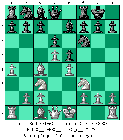Last move : 1/2-1/2 2025 December 6 15:8:44 [Event "FICGS__CHESS__CLASS_A__000294"] [Site "FICGS"] [Date "2025.09.04"] [Round "1"] [White "Tambe,Rod"] [Black "Jempty,George"] [Result "1/2-1/2"] [WhiteElo "2156"] [BlackElo "2009"] 1.e4 e5 2.Nf3 Nc6 3.Bc4 d6 4.d4 Nf6 5.d5 Nb8 6.Nc3 Be7 7.a4 O-O 8.Qe2 c6 9.O-O cxd5 10.Bxd5 Nxd5 11.Nxd5 Be6 12.c4 Qd7 13.b3 f5 14.Ba3 Bxd5 15.cxd5 Na6 16.Rad1 fxe4 17.Nd2 e3 18.fxe3 Nc7 19.Qd3 Rxf1+ 20.Rxf1 Rf8 21.Rc1 Ne8 22.h3 a6 23.Kh2 Bg5 24.a5 Nc7 25.Ne4 Be7 26.Nc3 Ne8 27.Ne4 Nc7 28.Qc4 Nb5 29.Bb4 Qf5 1/2-1/2 Follow this game move after move (download)Chess is mental torture. (Garry Kasparov) Stelle das Brett so, daß die Sonne in die Augen deines Gegners scheint. (Ruy López) Yo siempre he tenido un ligero sentimiento de lástima por una persona que no tiene conocimiento del Ajedrez. (Siegbert Tarrasch) Aux échecs, les retours au sommet sont rares : les dommages psychologiques consécutifs à une défaite sont trop sévères. (Daily Telegraph) The difference between stupidity and genius is that genius has its limits. (Murphy)