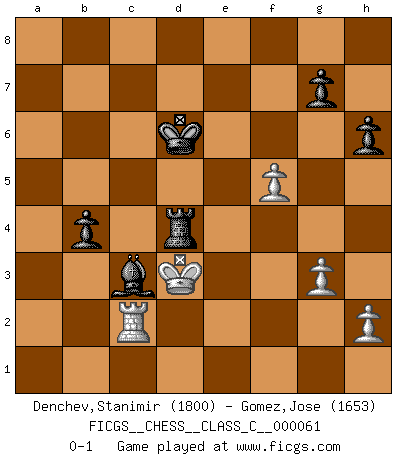 Last move : 0-1 2007 November 23 16:55:34 [Event "FICGS__CHESS__CLASS_C__000061"] [Site "FICGS"] [Date "2007.10.07"] [Round "1"] [White "Denchev,Stanimir"] [Black "Gomez,Jose"] [Result "0-1"] [WhiteElo "1800"] [BlackElo "1653"] 1.d4 d5 2.c4 dxc4 3.Nf3 c6 4.a4 Qa5+ 5.Bd2 Qf5 6.Nc3 Nf6 7.g3 Na6 8.Bg2 Nb4 9.O-O Qh5 10.Ng5 h6 11.Nf3 Bh3 12.e4 Bxg2 13.Kxg2 Nd3 14.b3 Qg4 15.e5 Nh5 16.bxc4 Nhf4+ 17.Bxf4 Nxf4+ 18.Kh1 Nh3 19.Ng1 Qxd1 20.Raxd1 Nxg1 21.Kxg1 b6 22.f4 e6 23.d5 cxd5 24.cxd5 exd5 25.Nxd5 Bc5+ 26.Kg2 O-O-O 27.Rd3 Kb7 28.Rfd1 Rd7 29.f5 Re8 30.Nf4 Rxd3 31.Nxd3 Bd4 32.Re1 a6 33.Kf3 Bc3 34.Re2 b5 35.e6 fxe6 36.axb5 axb5 37.Nc5+ Kc6 38.Nxe6 Rc8 39.Ke4 Kd6 40.Rc2 b4 41.Nd4 Rc4 42.Kd3 Rxd4+ 0-1 QGA : 3.Nf3 Kingside Castling by player White (move 9) Queenside Castling by player Black (move 26) Player Black won this chess game. Follow this game move after move (download)Chess books should be used as we use glasses: to assist the sight, although some players make use of them as if they thought they conferred sight. (Jose Raul Capablanca) Alles was am Schachbrett zählt sind gute Züge. (Robert James Fischer) Es muy difícil jugar en contra de la teoría de Einstein. - en su primera derrota en contra de Fischer (Mikhail Tal) C'est la seule position que je connaisse où les deux camps sont mals. Propos prêtés à V. Anand. Statistics can be made to prove anything - even the truth. (Author unknown)