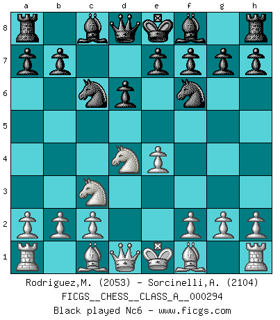 Last move : 1/2-1/2 2025 October 23 7:40:38 [Event "FICGS__CHESS__CLASS_A__000294"] [Site "FICGS"] [Date "2025.09.04"] [Round "1"] [White "Rodriguez,Mariano"] [Black "Sorcinelli,Andrea"] [Result "1/2-1/2"] [WhiteElo "2053"] [BlackElo "2104"] 1.e4 c5 2.Nf3 d6 3.d4 cxd4 4.Nxd4 Nf6 5.Nc3 Nc6 6.Bc4 Bd7 7.Nxc6 Bxc6 8.Qe2 g6 9.Bg5 Bg7 10.O-O-O Qc7 11.h4 h6 12.Bf4 a6 13.Kb1 b5 14.Bb3 Qb7 15.Nd5 Bxd5 16.Bxd5 Nxd5 17.exd5 Qd7 18.h5 g5 19.Be3 O-O 20.f4 gxf4 21.Bxf4 Rac8 22.Rhf1 Rc4 23.b3 Rc3 24.Be3 Rfc8 25.Rd2 e5 26.g4 e4 27.Qf2 a5 28.Qg1 Be5 29.g5 Qh3 30.Re2 a4 31.gxh6 Kh8 32.Rxf7 axb3 33.axb3 Ra8 34.Bd4 Rxb3+ 35.Kc1 1/2-1/2 Follow this game move after move (download)Chess is a forcing house where the fruits of character can ripen more fully than in life. (Edward Morgan Foster) Über Karpov: Er war und ist ein Vertreter der russischen Reaktionäre. Das steckt tief in seiner Seele, wehalb ich nicht nett mit ihm umgehen kann. (Viktor Kortschnoi) ¿Porque tengo que perder ante este idiota?. (Aron Nimzovich) La vie et les Echecs sont tous les deux une lutte constante. (Lasker) God, you are such an idiot. - Actually, I thought I was more of a jerk. (Gregory House to Stacy Warner, House M.D.)