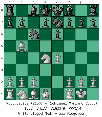 Last move : 1/2-1/2 2025 November 7 11:0:14 [Event "FICGS__CHESS__CLASS_A__000294"] [Site "FICGS"] [Date "2025.09.04"] [Round "1"] [White "Nudo,Davide"] [Black "Rodriguez,Mariano"] [Result "1/2-1/2"] [WhiteElo "2150"] [BlackElo "2053"] 1.e4 c5 2.Nf3 Nc6 3.Bb5 e6 4.O-O Nge7 5.d4 cxd4 6.Nxd4 Ng6 7.Be2 Be7 8.c4 Nxd4 9.Qxd4 O-O 10.Nc3 b6 11.Be3 Bf6 12.Qd2 Bb7 13.f3 Qe7 14.Rad1 Rad8 15.Qd6 Bc6 16.Qxe7 Bxe7 17.g3 f5 18.exf5 Rxf5 19.f4 Bf6 20.Rd3 Ra5 21.Bd4 Bxd4+ 22.Rxd4 e5 23.fxe5 Rxe5 24.Bd1 Rf8 25.Nb5 Rxf1+ 26.Kxf1 a5 27.Na7 Kf8 28.Bc2 Re6 29.Bxg6 Rxg6 30.Nxc6 dxc6 31.Rd7 Rh6 32.Kg1 g5 33.Rb7 Rd6 34.Rxb6 Rd1+ 35.Kf2 Rd2+ 36.Ke3 Rxh2 37.Kd4 g4 38.Rxc6 Rxb2 39.Rh6 Rxa2 40.Rxh7 Rg2 1/2-1/2 Follow this game move after move (download)In Chess, at least, the brave inherit the earth. (Edmar Mednis) Ein bischen Romantik kann weder im Schach noch in der Liebe schaden. Also versuche ich mich ab und zu daran zu erinnern. (Nigel Short) ¿Que sería del Ajedrez sin errores graciosos?. (Kurt Richter) Les Echecs représentent une sphère d'idées créatrices basée sur la volonté des deux protagonistes. (Smyslov) It is not true that people stop pursuing dreams because they grow old, they grow old because they stop pursuing dreams. (Gabriel Garcia Marquez)