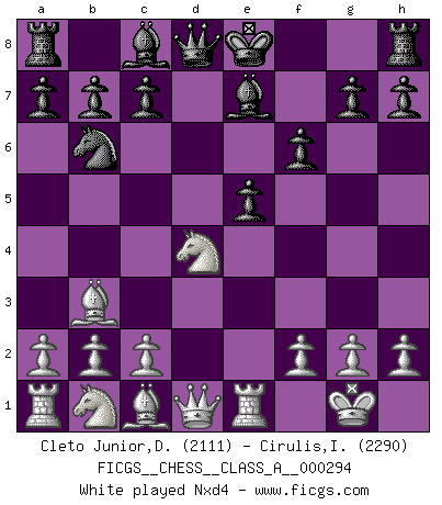 Last move : 1/2-1/2 2025 September 21 14:3:44 [Event "FICGS__CHESS__CLASS_A__000294"] [Site "FICGS"] [Date "2025.09.04"] [Round "1"] [White "Cleto Junior,Dirceu"] [Black "Cirulis,Ilmars"] [Result "1/2-1/2"] [WhiteElo "2111"] [BlackElo "2290"] 1.e4 e5 2.Bc4 Nf6 3.d3 d5 4.exd5 Nxd5 5.Nf3 Nc6 6.O-O Be7 7.Re1 f6 8.d4 Nb6 9.Bb3 Nxd4 10.Nxd4 Qxd4 11.Qxd4 exd4 12.Bf4 Bf5 13.Bxc7 Kd7 14.Nd2 Bc5 15.Ne4 Kxc7 16.Nxc5 Rae8 17.Be6 Bxc2 18.Rac1 Bg6 19.Red1 Rd8 20.Bb3 Kb8 21.Ne6 1/2-1/2 Follow this game move after move (download)Checkers is for tramps. (Paul Morphy) Der Freibauer hat für mich eine Seele, genau wie der Mensch, Wünsche, die unerkannt in ihm schlummern, und Befürchtungen, von deren Existenz er selbst kaum ahnt. (Aaron Nimzowitsch) Yo he agregado estos principios a la ley: pongan los Caballos en acción antes de que los dos Alfiles sean desarrollados. (Emanuel Lasker) Un footballeur joue avec ses pieds, parfois avec sa tête. Un joueur d'échecs ne joue qu'avec sa tête. Et quand il ne joue plus, il meurt. (Jacob Murray) Faith : not wanting to know what is true. (Friedrich Nietzsche)