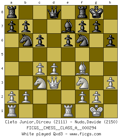 Last move : 1/2-1/2 2025 October 6 12:7:22 [Event "FICGS__CHESS__CLASS_A__000294"] [Site "FICGS"] [Date "2025.09.04"] [Round "1"] [White "Cleto Junior,Dirceu"] [Black "Nudo,Davide"] [Result "1/2-1/2"] [WhiteElo "2111"] [BlackElo "2150"] 1.e4 Nf6 2.e5 Nd5 3.d4 d6 4.Nf3 dxe5 5.Nxe5 c6 6.Be2 Bf5 7.O-O Nd7 8.Nf3 e6 9.c4 N5b6 10.Nc3 Be7 11.Bf4 O-O 12.Re1 Nf6 13.h3 h6 14.Bd3 Bxd3 15.Qxd3 c5 16.Rad1 cxd4 17.Nxd4 Bc5 18.Qe2 Qc8 19.Ne4 Nxe4 20.Qxe4 Rd8 21.b3 Rd7 22.Nf3 Bb4 23.Rf1 Re7 24.Bc1 a5 25.Qg4 e5 26.Qxc8+ Rxc8 27.Nh4 Rec7 28.Be3 Nd7 29.Rd5 a4 30.Nf5 Bf8 31.Rb5 f6 32.g4 axb3 33.axb3 Nc5 34.h4 Ra8 35.h5 Ra3 36.Bxc5 Bxc5 37.b4 Bd4 38.c5 Rb3 39.Nd6 Kh7 40.Kg2 g6 41.Ne8 Rf7 42.Rb6 gxh5 43.Nxf6+ Kg6 44.Ne4 Kg7 45.gxh5 Kf8 46.f3 Re3 47.Ng3 Rb3 48.Ne4 1/2-1/2 Follow this game move after move (download)The hallmark of the artist is simplicity. (Larry Evans) Kostenjuk hat keinen Sexappeal. (Loek van Wely) El Ajedrez es el gimnasio de la mente. (Blaise Pascal) Je fais ceci parce que dans cinquante coups j'obtiendrai cela; je m'appelle Mikhail Moisevitch Botvinnik. (Botvinnik) Plans are ideas that never come to fruition. (Daniel Parmet)