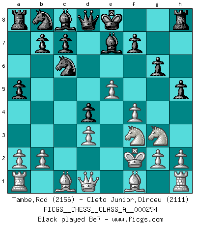 Last move : 1/2-1/2 2025 November 22 10:9:57 [Event "FICGS__CHESS__CLASS_A__000294"] [Site "FICGS"] [Date "2025.09.04"] [Round "1"] [White "Tambe,Rod"] [Black "Cleto Junior,Dirceu"] [Result "1/2-1/2"] [WhiteElo "2156"] [BlackElo "2111"] 1.Nc3 d5 2.e4 d4 3.Nce2 e5 4.c3 Ne7 5.cxd4 exd4 6.d3 a5 7.f4 Nec6 8.Ng3 Bb4+ 9.Kf2 g6 10.Nf3 h5 11.e5 Be7 12.Bd2 Na6 13.Ne4 Nc5 14.Qc2 b6 15.Be2 Bf5 16.Nfg5 Bxg5 17.Nxg5 O-O 18.Rhe1 Nb4 19.Bxb4 axb4 20.Qd2 Ne6 21.Nxe6 Bxe6 22.Bf3 Ra5 23.Bc6 f6 24.Kg1 fxe5 25.fxe5 Qe7 26.Qh6 Qg7 27.Qg5 Rc5 28.Rac1 Rxc1 1/2-1/2 Follow this game move after move (download)Spassky will not be psyched out by Fischer. (Mike Goodall) Ich liebe den Moment, wenn ich das Ego meines Gegenüber breche. (Robert James Fischer) Fischer sacrificó virtualmente todo lo que la mayoría de nosotros los 'debiles' (término que él usa) valoramos, respetamos y apreciamos por el amor de un astuto, a menudo hermoso tablero de juego, por el privilegio ambivalente de ser su mas grande maestro. (Paul Kollar) Nous sommes les pions de la mystérieuse partie d'Echecs jouée par Dieu. Il nous déplace, nous arrête, nous pousse encore, puis nous lance un à un dans la boîte du Néant. Epitaphe sur la tombe de David Janowsky (1868-1927). After growing wildly for years, the field of computing appears to be reaching its infancy. (John Pierce)