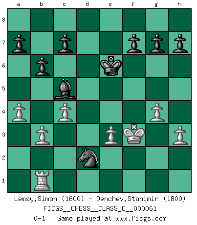 Last move : 0-1 2007 October 12 15:16:46 [Event "FICGS__CHESS__CLASS_C__000061"] [Site "FICGS"] [Date "2007.10.07"] [Round "1"] [White "Lemay,Simon"] [Black "Denchev,Stanimir"] [Result "0-1"] [WhiteElo "1600"] [BlackElo "1800"] 1.e4 e5 2.Nf3 d6 3.Be2 Nf6 4.Nc3 Be7 5.O-O O-O 6.d4 exd4 7.Nxd4 Nbd7 8.Be3 d5 9.exd5 Nb6 10.Nb3 Nbxd5 11.Nxd5 Nxd5 12.Bc4 Be6 13.Nc5 Nxe3 14.Qxd8 Bxd8 15.Nxe6 Nxc4 16.Nxf8 Kxf8 17.b3 Nd6 18.c4 Bf6 19.Rad1 b6 20.Rfe1 Re8 21.Rf1 Re2 22.a4 Bc3 23.g3 Ke7 24.Rd3 Bb4 25.Kg2 Nb7 26.Rfd1 Bd6 27.Re3+ Rxe3 28.fxe3 Nc5 29.Rb1 Ke6 30.h3 Ne4 31.g4 Bc5 32.Kf3 Nd2+ 0-1 Philidor's defense Kingside Castling by player White (move 5) Kingside Castling by player Black (move 5) Player Black won this chess game. Follow this game move after move (download)Place the contents of the Chess box in a hat, shake them up vigorously, pour them on the board from a height of two feet, and you get the style of Steinitz. (H. E. Bird) Wer der Ansicht ist, daß alle Schachspieler verrückt sind, wird durch Studium des Lebens von Emil Josef Diemer nicht auf andere Gedanken kommen. (Hans Ree) La mitad de las variaciones que son calculadas en una partida de torneo, resultan ser completamente superfluas. Desafortunadamente, nadie sabe por adelantado cual mitad. (Jan Tinman) La tactique, c'est ce que vous faites quand il y a quelque chose à faire; la stratégie, c'est ce que vous faites quand il n'y a rien à faire. (Savielli Tartacower) Life is painting a picture, not doing a sum. (Oliver Wendell Holmes, Jr.)