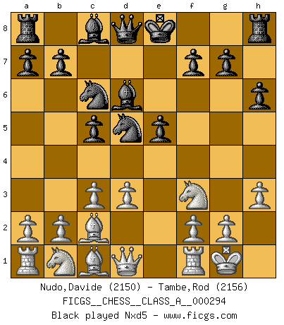 Last move : 1/2-1/2 2025 October 29 20:1:35 [Event "FICGS__CHESS__CLASS_A__000294"] [Site "FICGS"] [Date "2025.09.04"] [Round "1"] [White "Nudo,Davide"] [Black "Tambe,Rod"] [Result "1/2-1/2"] [WhiteElo "2150"] [BlackElo "2156"] 1.e4 c5 2.Nf3 d6 3.c3 Nf6 4.h3 Nc6 5.Bd3 e5 6.Bc2 d5 7.d3 h6 8.O-O Bd6 9.exd5 Nxd5 10.d4 exd4 11.cxd4 O-O 12.Nc3 Ndb4 13.dxc5 Nxc2 14.Qxc2 Bxc5 15.Rd1 Qa5 16.Nd5 Be6 17.Bxh6 gxh6 18.Nf6+ Kg7 19.Nh5+ Kh8 20.Nf6 1/2-1/2 Follow this game move after move (download)War is the child of passion, passion is the child of narcissism and narcissism is the child. (...) Another game ? (Thibault de Vassal) Die Elozahlen sind sehr schlecht für das Schach. Jetzt ist Schach eine Sportindustrie, die darauf zielt Elopunkte zu machen. (Miguel Najdorf) Nunca antes ha habido un jugador de Ajedrez con tal conocimiento a fondo de las complejidades del juego y una inmensa voluntad absolutamente indomable de ganar. Yo pienso que Fischer es el jugador mas grande que jamás haya existido. (Lisa Lane) La vie est comme un jeu d'échecs : nous esquissons un plan, mais celui-ci est tributaire de ce que daignent faire l'adversaire aux échecs et le destin dans la vie. (Arthur Schopenhauer) Two beer, or not two beer. (Unknown)
