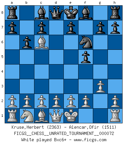 Last move : 1-0 2025 October 26 18:31:57 [Event "FICGS__CHESS__UNRATED_TOURNAMENT__000072"] [Site "FICGS"] [Date "2025.09.09"] [Round "1"] [White "Kruse,Herbert"] [Black "Alencar,Ofir"] [Result "1-0"] [WhiteElo "2363"] [BlackElo "1511"] 1.g3 f5 2.Bg2 Nf6 3.Nf3 b6 4.Ne5 Nc6 5.Nxc6 dxc6 6.Bxc6+ 1-0 Follow this game move after move (download)The beauty of a move lies not in its' appearance but in the thought behind it. (Siegbert Tarrasch) Bobby Fischer ist kein Vorbild für die heutige Jugend. (Viktor Kortschnoi) Robert Fischer es la ley hacia si mismo. (Larry Evans) Les pièces de l'échiquier étaient impitoyables. Elles le retenaient, elles l'absorbaient. Il y avait de l'horreur en cela, mais aussi une harmonie unique. Car, qu'y a-t-il dans le monde, à part les échecs ? (V. Nabokov) Life is the sum of all your choices. (Albert Camus)