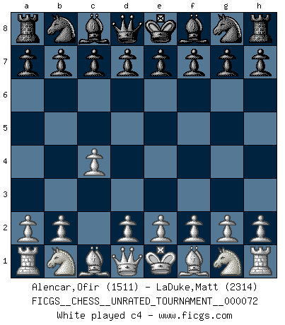 Last move : 0-1 2025 November 19 11:48:30 [Event "FICGS__CHESS__UNRATED_TOURNAMENT__000072"] [Site "FICGS"] [Date "2025.09.09"] [Round "1"] [White "Alencar,Ofir"] [Black "LaDuke,Matt"] [Result "0-1"] [WhiteElo "1511"] [BlackElo "2314"] 1.c4 e5 2.Nc3 Nf6 3.g3 Bb4 4.a3 Bxc3 5.bxc3 O-O 6.d4 d6 7.Bg5 h6 8.Bxf6 Qxf6 9.Bh3 Bxh3 10.Nxh3 Qe6 11.Ng1 Qxc4 12.Qd3 Qc6 13.f3 Nd7 14.Qe4 Qxc3+ 0-1 Follow this game move after move (download)Chess is a fairy tale of 1001 blunders. (Savielly Tartakower) Im Reiche der Wirklichkeit ist man nie so glücklich wie im Reiche der Gedanken. (Arthur Schopenhauer) Hoy en día, si tu no eres un Gran Maestro a los 14 años, es mejor que lo olvides. (Anand Viswanathan) La conception d'un plan est le processus par lequel un joueur exploite les avantages de sa position tout en s'efforçant d'en réduire au minimum les inconvénients. Afin de garantir le succès, un plan doit toujours se fonder sur un diagnostic objectif des particularités d'une position. La conception d'un plan est d'autant plus difficile que la position est équilibrée, et grandement facilitée lorsqu'il n'existe qu'un seul plan susceptible de répondre aux exigences de la position. (Harry Golombek) Creativity is inventing, experimenting, growing, taking risks, breaking rules, making mistakes, and having fun. (Mary Lou Cook)