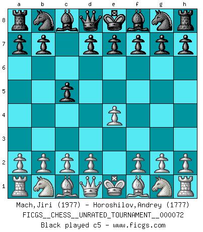 Last move : b5 2025 December 28 15:56:6 White clock - 13 days 01:27:41 Black clock - 100 days 00:00:00 [Event "FICGS__CHESS__UNRATED_TOURNAMENT__000072"] [Site "FICGS"] [Date "2025.09.09"] [Round "1"] [White "Mach,Jiri"] [Black "Horoshilov,Andrey"] [Result "*"] [WhiteElo "1977"] [BlackElo "1777"] 1.e4 c5 2.Nf3 e6 3.d4 cxd4 4.Nxd4 d6 5.c4 Nc6 6.Nc3 Be7 7.Be3 Nf6 8.Be2 O-O 9.O-O Nxd4 10.Bxd4 b6 11.Qd2 Bb7 12.f3 Nd7 13.Rfd1 a6 14.Bf1 Rc8 15.Rac1 Nc5 16.b4 Nd7 17.Qe1 Bg5 18.Be3 Bxe3+ 19.Qxe3 Ne5 20.Na4 b5 21.* Follow this game move after move (download)Only the player with the initiative has the right to attack. (Wilhelm Steinitz) Es gibt keine einzige Frau, der ich nicht einen Springer vorgeben könnte und trotzdem gewänne. (Robert James Fischer) El Ajedrez es una hermosa aventura. (Bent Larsen) Même un GMI sait rarement calculer sur plus de cinq coups une attaque à sacrifices. (Rudolf Spielmann) Logic : The art of thinking and reasoning in strict accordance with the limitations and incapacities of the human misunderstanding. (Ambrose Bierce)