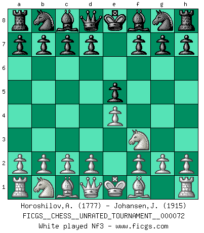 Last move : 1-0 2025 October 31 11:55:55 [Event "FICGS__CHESS__UNRATED_TOURNAMENT__000072"] [Site "FICGS"] [Date "2025.09.09"] [Round "1"] [White "Horoshilov,Andrey"] [Black "Johansen,Jorgen"] [Result "1-0"] [WhiteElo "1777"] [BlackElo "1915"] 1.e4 e5 2.Nf3 1-0 This chess game has been lost on time (started : 2025.09.09 19:54:35) Follow this game move after move (download)Winning isn't everything... but losing is nothing. (Mednis) Herr Iljumschinow ist ein etwas merkwürdiger Geschäftsmann: Er arbeitet zusammen mit Leuten wie Muammar al-Gaddafi; früher ist das Saddam Hussein gewesen. (Joel Lautier) Todo se encuentra en un estado de flujo y esto incluye al mundo del Ajedrez. (Mikhail Botvinnik) Psychologiquement, tu dois avoir confiance en toi même, mais cette confiance doit être basée sur des faits. (Robert Fischer) A bird doesn't sing because it has an answer, it sings because it has a song. (Maya Angelou)