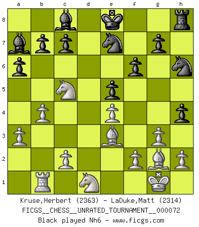 Last move : 1/2-1/2 2025 November 16 16:24:4 [Event "FICGS__CHESS__UNRATED_TOURNAMENT__000072"] [Site "FICGS"] [Date "2025.09.09"] [Round "1"] [White "Kruse,Herbert"] [Black "LaDuke,Matt"] [Result "1/2-1/2"] [WhiteElo "2363"] [BlackElo "2314"] 1.g3 d5 2.Bg2 e5 3.d3 Nc6 4.Nf3 Be6 5.O-O f6 6.e4 dxe4 7.dxe4 Qxd1 8.Rxd1 Bc5 9.Nc3 Nce7 10.a3 a6 11.b4 Ba7 12.Rb1 Rd8 13.Ne1 h5 14.Nd3 h4 15.Nc5 Rxd1+ 16.Nxd1 Bc8 17.Be3 Nh6 18.f3 Nf7 19.Nd3 Bxe3+ 20.Nxe3 Nc6 21.c3 b6 22.Nd5 Kd8 23.Rd1 1/2-1/2 Follow this game move after move (download)Is Bobby Fischer quite sane ? (Salo Flohr) Über die Verhaftung Bobby Fischers: Warum es die Bush-Administration für nötig befindet einen 61 Jahre alten Mann zu hetzten, der für niemanden ausser sich selbste eine Gefahr darstellt ist ein Rätsel. (Nigel Short) La esencia del Ajedrez es pensar acerca de lo que el Ajedrez es. (David Bronstein) Botvinnik disait en comparant les échecs à la musique: Il existe une science dont le but est l'étude de l'acoustique et des sons. Mais il y a aussi un art qui se sert de l'océan des sons : c'est la musique. De toute évidence, il en est de même pour la pensée. La logique est l'étude des lois de la réflexion et les échecs reflètent, en tant qu'art, le côté logique de la réflexion, sous la forme d'images artistiques... Extrait de Fischer - Spassky, Reykjavik 1972 par Alexander & F. Wyndham (Ed. Solar), p 37. All maxims have their antagonist maxims; proverbs should be sold in pairs, a single one being but a half truth. (William Mathews)