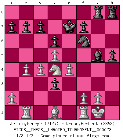 Last move : 1/2-1/2 2025 September 20 11:51:19 [Event "FICGS__CHESS__UNRATED_TOURNAMENT__000072"] [Site "FICGS"] [Date "2025.09.09"] [Round "1"] [White "Jempty,George"] [Black "Kruse,Herbert"] [Result "1/2-1/2"] [WhiteElo "2127"] [BlackElo "2363"] 1.d4 g6 2.e4 Bg7 3.c4 d6 4.Be2 Nc6 5.Be3 e5 6.Nf3 Bg4 7.d5 Bxf3 8.Bxf3 Nd4 9.Qa4+ Qd7 10.Qxd7+ Kxd7 11.Bd1 Nf6 12.Nc3 h5 13.O-O Ke7 14.h4 Bh6 15.Rb1 Rag8 16.b4 g5 17.hxg5 Bxg5 18.Bxd4 exd4 19.Nb5 d3 20.Nd4 1/2-1/2 Follow this game move after move (download)No price is too great for the scalp of the enemy King. (Koblentz) Zu meiner Zeit war ein 20 jähriger ein junger Spieler, heute ist er ein Veteran. (Garry Kasparov) Un jugador que trata de regresar una movida en el Ajedrez es un futuro carterista. (Richard Fenton) On croit qu'il y a plus de mauvais joueurs que de bons joueurs, c'est faux : Il y a autant de joueurs qui gagnent que de joueurs qui perdent. (Philippe Geluck) Life is pain my dear and anyone who says otherwise is selling something. (Princess Bride)