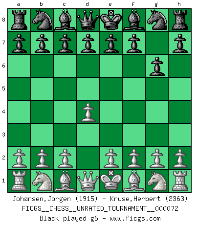 Last move : 0-1 2025 October 31 8:56:0 [Event "FICGS__CHESS__UNRATED_TOURNAMENT__000072"] [Site "FICGS"] [Date "2025.09.09"] [Round "1"] [White "Johansen,Jorgen"] [Black "Kruse,Herbert"] [Result "0-1"] [WhiteElo "1915"] [BlackElo "2363"] 1.d4 g6 2.e4 Bg7 0-1 This chess game has been lost on time (started : 2025.09.09 19:54:35) Follow this game move after move (download)On the chessboard, lies and hypocrisy do not survive long. (Emanuel Lasker) Stelle das Brett so, daß die Sonne in die Augen deines Gegners scheint. (Ruy López) El Ajedrez hace al hombre ser mas sabio y ver mas claro. (Vladimir Putin) Je crois qu'il existe des manières très spécifiques de jouer efficacement contre une machine. Evidemment, nous n'avons aucune chance en technique pure, parce que l'ordinateur calcule de manière parfaite. Mais lorsque nous faisons appel à notre cerveau, en utilisant l'intuition et la compréhension, alors nous restons beaucoup plus forts. (Anatoli Karpov) To steal ideas from one person is plagiarism. To steal from many is research. (Unknown)