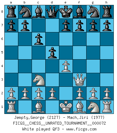 Last move : 1/2-1/2 2025 December 24 4:44:53 [Event "FICGS__CHESS__UNRATED_TOURNAMENT__000072"] [Site "FICGS"] [Date "2025.09.09"] [Round "1"] [White "Jempty,George"] [Black "Mach,Jiri"] [Result "1/2-1/2"] [WhiteElo "2127"] [BlackElo "1977"] 1.e4 c6 2.Nc3 d5 3.Qf3 dxe4 4.Nxe4 Nd7 5.d4 Ngf6 6.c3 Nxe4 7.Qxe4 Nf6 8.Qc2 Bg4 9.Be2 Bxe2 10.Qxe2 e6 11.Nf3 Be7 12.Bf4 O-O 13.O-O Qd5 14.a4 1/2-1/2 Follow this game move after move (download)Is Bobby Fischer quite sane ? (Salo Flohr) Ein Kibitz ist einer, der deinem Gegner gute Ratschläge gibt. (Andrew Soltis) El Ajedrez era la lengua materna de Capablanca. (Reti) Mon pion favori sur ma case favorite ! Bronstein en parlant d'un coup de pion en h5 quand il avait les Noirs. Good luck. You're gonna need it. (Han Solo in Star Wars ep.6)