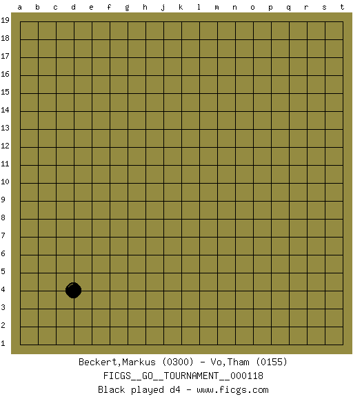 Last move : 1-0 2025 October 10 3:2:19 [Event "FICGS__GO__TOURNAMENT__000118"] [Site "FICGS"] [Date "2025.09.09"] [Round "1"] [Black "Beckert,Markus"] [White "Vo,Tham"] [Result "1-0"] [Rating 1 "0300"] [Rating 2 "0155"] 1.d4 1-0 This go game has been lost on time (started : 2025.09.09 21:22:24) Follow this game move after move (download)Corner, side, centre. (Anonymous) The worth of a book is to be measured by what you can carry away from it. (James Bryce)