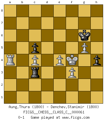 Last move : 0-1 2008 February 7 0:45:38 [Event "FICGS__CHESS__CLASS_C__000061"] [Site "FICGS"] [Date "2007.10.07"] [Round "1"] [White "Aung,Thura"] [Black "Denchev,Stanimir"] [Result "0-1"] [WhiteElo "1800"] [BlackElo "1800"] 1.e4 e5 2.Bc4 Nf6 3.Nc3 Bc5 4.d3 d6 5.Be3 O-O 6.Bxc5 dxc5 7.Nf3 Nbd7 8.O-O c6 9.a4 h6 10.a5 Re8 11.Qd2 Nf8 12.Qe3 Qd6 13.Na4 N6d7 14.Nh4 Ne6 15.Bxe6 Rxe6 16.Nf5 Qf8 17.b3 b6 18.axb6 axb6 19.b4 cxb4 20.Nxb6 Rxa1 21.Rxa1 Nxb6 22.Qxb6 Re8 23.Ne3 Bd7 24.Qc7 Rd8 25.Qxe5 b3 26.cxb3 Be6 27.Qc3 Qd6 28.Rd1 c5 29.Nc4 Qc6 30.f3 Bxc4 31.bxc4 Rd4 32.Kf2 Qd6 33.g3 Qa6 34.Ra1 Rxd3 35.Qxg7+ Kxg7 36.Rxa6 Rc3 37.Ra4 Rc2+ 38.Ke3 Rc3+ 39.Kf4 f6 40.g4 Kg6 41.h4 h5 42.g5 fxg5+ 43.hxg5 h4 0-1 Bishop's Opening : Berlin defense Kingside Castling by player Black (move 5) Kingside Castling by player White (move 8) 10 pieces endgame at move 43 : White KRPPPP , Black KRPP WHITE : King + 1 Rook 4 Pawns BLACK : King + 1 Rook 2 Pawns Player Black won this chess game. Follow this game move after move (download)Chess is like war on a board. (Bobby Fischer) Zeige mir drei Eröffnungsvarianten und ich beweise dir, dass zwei davon inkorrekt sind. (Emanuel Lasker) Personalmente, yo prefiero mirar hacia el futuro en donde un programa de computadora gane el título mundial de Ajedrez. La humanidad necesita una lección de humildad. (Richard Dawkings) Mais l'homme est une créature légère et illogique : semblable au joueur d'échecs, il n'aime que le processus du but à atteindre, non le but lui-même. (Dostoïevsky) I just play for fun. (Anna Kournikova)