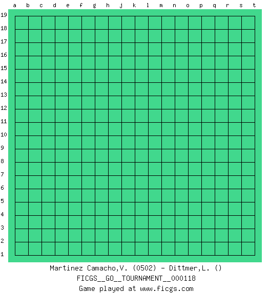 Last move : 1-0 2025 November 14 14:48:25 [Event "FICGS__GO__TOURNAMENT__000118"] [Site "FICGS"] [Date "2025.09.09"] [Round "1"] [Black "Martinez Camacho,Victor Hugo"] [White "Dittmer,Lutz"] [Result "1-0"] [Rating 1 "0502"] 1.e4 q4 2.h5 q16 3.l5 e8 4.o5 r18 5.q5 d9 6.f6 e9 7.e6 c8 8.q10 c9 9.d6 d10 10.q13 e10 11.f8 1-0 This go game has been lost on time (started : 2025.09.09 21:22:24) Follow this game move after move (download)While the Baroque rules of chess could only have been created by humans, the rules of go are so elegant, organic, and rigorously logical that if intelligent life forms exist elsewhere in the universe, they almost certainly play go. (Edward Lasker, international chess master) Information on the Internet is subject to the same rules and regulations as conversation at a bar. (George Lundberg)