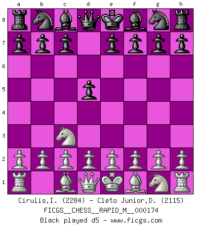 Last move : 1/2-1/2 2025 October 3 10:26:5 [Event "FICGS__CHESS__RAPID_M__000174"] [Site "FICGS"] [Date "2025.09.14"] [Round "1"] [White "Cirulis,Ilmars"] [Black "Cleto Junior,Dirceu"] [Result "1/2-1/2"] [WhiteElo "2284"] [BlackElo "2115"] 1.Nc3 d5 2.Nf3 Nf6 3.e3 c5 4.d4 e6 5.Bd3 c4 6.Be2 a6 7.a4 Bb4 8.O-O Nc6 9.Nb1 Bd7 10.c3 Be7 11.b3 b5 12.Nbd2 O-O 13.Ba3 Qc7 14.Bxe7 Nxe7 15.Ne5 Rfb8 16.Qc2 Be8 17.Bf3 h6 18.bxc4 bxc4 19.e4 a5 20.exd5 exd5 21.h4 Ra6 22.Rfe1 Ng6 1/2-1/2 Follow this game move after move (download)Chess is not like life... it has rules ! (Mark Pasternak) Ein typischer, sehr verbreiteter Gedankenschädling ist der, daß der betreffende Amateur von der Annanhme ausgeht, daß jeder einzelne Zug etwas zu leisten habe. (Aaron Nimzowitsch) El Ajedrez no es una pizca de inferior al violín, y tenemos un gran número de violinistas profesionales. (Mikhail Botvinnik) La solitude du joueur d'Echecs à l'approche du mat est semblable à celle du condamné. (Francis Szpiner) Experiences are the keys to life. (Daniel Parmet)