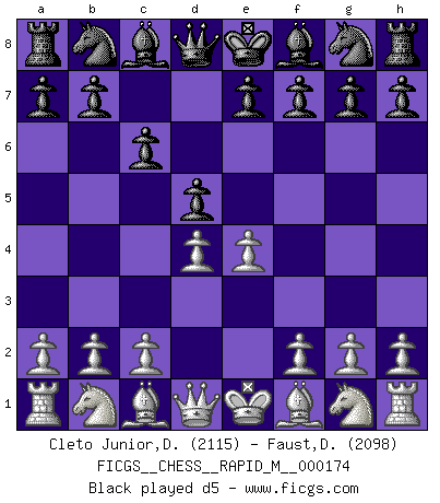 Last move : 1/2-1/2 2025 October 22 9:46:13 [Event "FICGS__CHESS__RAPID_M__000174"] [Site "FICGS"] [Date "2025.09.14"] [Round "1"] [White "Cleto Junior,Dirceu"] [Black "Faust,Dieter"] [Result "1/2-1/2"] [WhiteElo "2115"] [BlackElo "2098"] 1.e4 c6 2.d4 d5 3.e5 Bf5 4.Nf3 e6 5.Be2 Ne7 6.O-O c5 7.c4 Nbc6 8.dxc5 d4 9.Qb3 Qd7 10.Rd1 Ng6 11.Nc3 Bxc5 12.Qb5 b6 13.Na4 Ncxe5 14.Nxd4 Bxd4 15.Qxd7+ Nxd7 16.Rxd4 e5 17.Rd5 O-O-O 18.Nc3 Nc5 19.Be3 Rxd5 20.Nxd5 Ne6 21.g3 Rd8 22.h4 Nc7 23.Nxc7 Kxc7 24.Bf1 Bd3 25.h5 Ne7 26.h6 Bxf1 27.Kxf1 g6 28.Bg5 Rd7 29.Bf6 1/2-1/2 Follow this game move after move (download)Chess is a cold bath for the mind. (Sir John Simon) Wie kann ich Remis annehmen? Ich weiß ja gar nicht, wie ich stehe! (Fritz Sämisch) Debemos de asegurarnos de que el Ajedrez no se convierta en un lenguaje muerto, muy interesante, pero solo para un grupo muy pequeño. (Sytze Faber) Les échecs c'est le défi de l'alpiniste, toujours plus haut, prêt à tout pour monter à l'assaut du Roi ennemi. Les échecs, c'est de la musique en mouvement, un ballet majestueux pour les yeux. C'est de la poésie composée par les fantômes du passé qui au même titre que Rimbaud ou Verlaine méritent notre admiration. Les échecs, c'est de la peinture ou le moindre mouvement modifie le tableau pour en faire un Picasso ou un Van Gogh. Les échecs, c'est tout et rien, c'est la vie et la mort. Jjulie33 sur le forum de France-Echecs. Treat your password like your toothbrush. Don't let anybody else use it, and get a new one every six months. (Clifford Stoll)