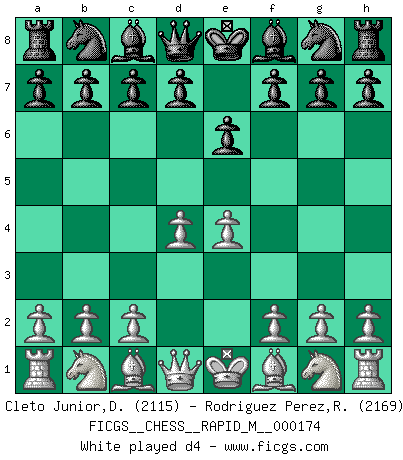 Last move : 1/2-1/2 2025 October 27 23:45:53 [Event "FICGS__CHESS__RAPID_M__000174"] [Site "FICGS"] [Date "2025.09.14"] [Round "1"] [White "Cleto Junior,Dirceu"] [Black "Rodriguez Perez,Rene"] [Result "1/2-1/2"] [WhiteElo "2115"] [BlackElo "2169"] 1.e4 e6 2.d4 d5 3.Nc3 Nf6 4.e5 Nfd7 5.f4 c5 6.Nf3 Nc6 7.Be3 a6 8.Ne2 Qb6 9.Qc1 Nxd4 10.Nexd4 cxd4 11.Nxd4 f6 12.exf6 Nxf6 13.c3 Bd7 14.Bd3 Ng4 15.g3 O-O-O 16.Bg1 e5 17.h3 exd4 18.hxg4 Bxg4 19.b4 Qe6+ 20.Kd2 Bf3 21.Bxd4 1/2-1/2 Follow this game move after move (download)Chess, like love, like music, has the power to make people happy. (Siegbert Tarrasch) Schach ist eine Sache der genauen Beurteilung, wann man zuschlagen und wann man sich ducken muss. (Robert James Fischer) El Ajedrez lo es todo: arte, ciencia y deporte. (Anatoly Karpov) J'ai toujours senti une vague pitié pour l'homme qui ne connaît rien aux échecs, tout comme j'en aurais pour un homme ignorant de l'amour. Les Echecs, comme la musique ou comme l'amour, ont le pouvoir de rendre heureux. (Siegbert Tarrasch) I don't believe in psychology. I believe in good moves. (Bobby Fischer)