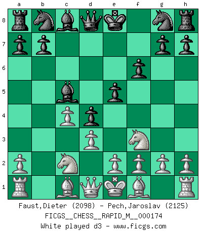 Last move : 1/2-1/2 2025 December 8 3:30:27 [Event "FICGS__CHESS__RAPID_M__000174"] [Site "FICGS"] [Date "2025.09.14"] [Round "1"] [White "Faust,Dieter"] [Black "Pech,Jaroslav"] [Result "1/2-1/2"] [WhiteElo "2098"] [BlackElo "2125"] 1.Nf3 d5 2.c4 d4 3.b4 f6 4.Na3 e5 5.Nc2 c5 6.bxc5 Bxc5 7.d3 Nc6 8.g3 Nge7 9.Bg2 O-O 10.O-O Bg4 11.Nd2 f5 12.Nb3 Bd6 13.f3 Bh5 14.f4 exf4 15.Bxf4 Ng6 16.Bxd6 Qxd6 17.Qe1 Rae8 18.Bd5+ Kh8 19.Ncxd4 Bg4 20.Nb5 Qd8 21.N5d4 Rf6 22.Qd2 a5 23.a4 Nxd4 24.Nxd4 Ne7 25.e4 fxe4 26.dxe4 Nxd5 27.exd5 Bh3 28.Rxf6 Qxf6 29.Qf2 Qd6 30.Re1 1/2-1/2 Follow this game move after move (download)In complicated positions, Bobby Fischer hardly had to be afraid of anybody. (Paul Keres) Ich tröste mich mit dem Vergnügen, daß Schachfans, Zuschauer und Leser glücklich sind, wenn ein Großmeister etwas riskiert, statt nur Klötzchen zu schieben. (Mikhail Nekhemyevich Tal) Si pudieramos observar el interior de la cabeza de un jugador de Ajedrez, encontraríamos ahí un mundo lleno de sentimientos, imágenes, ideas, emoción y pasión. (Alfred Binet) Il n'y a pas eu de défaite parce que je ne crois pas que cet ordinateur ait jamais existé. IBM a triché en refusant d'imprimer les modes de recherche de la machine. C'est évident, pendant le match, des coups décisifs ont été joués par des êtres humains. Aujourd'hui, les meilleurs spécialistes en informatique ne peuvent toujours pas expliquer comment Deep-Blue a pu jouer contre la logique des ordinateurs. IBM a gagné une guerre de communication, mais ils sont incapables de prouver que l'ordinateur a gagné tout seul. (Garry Kasparov) Games, world of games... There's always an opponent, and there's always a victim. (Revolver, movie)