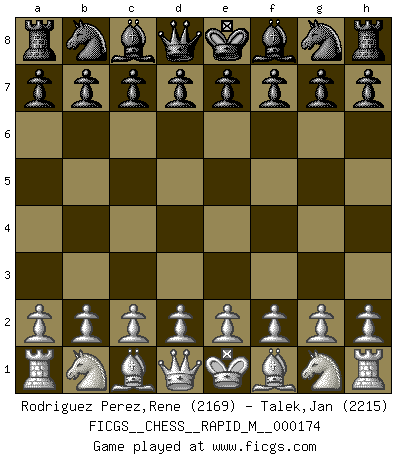Last move : 1/2-1/2 2025 November 16 21:44:30 [Event "FICGS__CHESS__RAPID_M__000174"] [Site "FICGS"] [Date "2025.09.14"] [Round "1"] [White "Rodriguez Perez,Rene"] [Black "Talek,Jan"] [Result "1/2-1/2"] [WhiteElo "2169"] [BlackElo "2215"] 1.e4 e6 2.d4 d5 3.Bd3 dxe4 4.Bxe4 Nf6 5.Bf3 c5 6.Ne2 Be7 7.Nbc3 O-O 8.Be3 Qc7 9.Bf4 Qa5 10.Qd3 Nc6 11.Qb5 Qxb5 12.Nxb5 a6 13.Bxc6 bxc6 14.Bd6 Bxd6 15.Nxd6 cxd4 16.Nxc8 Raxc8 17.Nxd4 c5 18.Ne2 Rfd8 19.h4 c4 20.Rd1 Nd5 21.Rh3 Rb8 22.b3 Rbc8 23.a3 g6 24.Rf3 cxb3 25.cxb3 Re8 1/2-1/2 Follow this game move after move (download)The tactician knows what to do when there is something to do; whereas the strategian knows what to do when there is nothing to do. (Gerald Abrahams) Schach verlangt totale Konzentration. (Robert James Fischer) Siempre es mejor sacrificar los hombres de tu oponente. (Savielly Tartakower) Votre seul travail dans les ouvertures est d'obtenir un milieu de partie jouable. (Lajos Portish) Somewhere in the world there is an epigram for every dilemma. (Hendrik Willem van Loon)