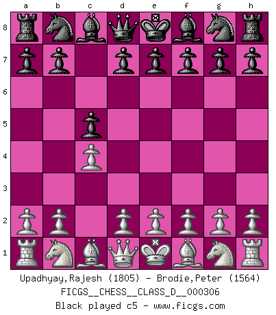 Last move : 0-1 2025 November 10 15:14:8 [Event "FICGS__CHESS__CLASS_D__000306"] [Site "FICGS"] [Date "2025.09.17"] [Round "1"] [White "Upadhyay,Rajesh"] [Black "Brodie,Peter"] [Result "0-1"] [WhiteElo "1805"] [BlackElo "1564"] 1.c4 c5 2.Nc3 Nc6 3.Nf3 Nf6 0-1 This chess game has been lost on time (started : 2025.09.17 14:52:51) Follow this game move after move (download)In Fischer's hands, a slight theoretical advantage is as good a being a Queen ahead. (Isaac Kashdan) Wenn Dein Gegner dir ein Remis anbietet, versuch herauszufinden, weshalb er glaubt schlechter zu stehen. (Nigel Short) Tu eres para mi la Reina en d8 y yo soy el Peón en d7!!. (GM Eduard Gufeld) Le temps de noter son nom sur la feuille de partie, j'étais déjà en zeitnot ! D'un modeste amateur apparié lors de la première ronde d'un open contre le grand-maître Azmaïparashvili. Hello Thibault, if I have had a plan (and I had one, I hope), I have forgotten it during the last week... - Hello Heinz-Georg. What do you mean a plan ? (Anonymous players, during a Big Chess game)