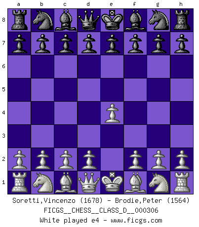 Last move : b5 2026 January 24 18:36:27 White clock - 73 days 17:36:24 Black clock - 36 days 11:56:25 [Event "FICGS__CHESS__CLASS_D__000306"] [Site "FICGS"] [Date "2025.09.17"] [Round "1"] [White "Soretti,Vincenzo"] [Black "Brodie,Peter"] [Result "*"] [WhiteElo "1678"] [BlackElo "1564"] 1.e4 e5 2.Nf3 Nc6 3.Bb5 d6 4.O-O Bd7 5.c3 Nf6 6.d3 Be7 7.Nbd2 O-O 8.Re1 a6 9.Ba4 b5 10.Bc2 Bg4 11.h3 Bxf3 12.Nxf3 h6 13.Bd2 Qd7 14.a4 bxa4 15.Bxa4 Rab8 16.Rb1 Rb6 17.Be3 Rb7 18.b4 Rfb8 19.Qb3 Qe6 20.Qxe6 fxe6 21.Bxc6 Rb6 22.Bxb6 cxb6 23.c4 Rc8 24.Bb7 Rc7 25.Bxa6 Kf7 26.d4 exd4 27.Nxd4 e5 28.Nf5 Ra7 29.b5 * Follow this game move after move (download)A great player and a great example for many. His book My 60 Memorable Games had a big impact on me. It is a shame he didn't continue to enrich the world of chess with his unparalleled understanding after 1972. (Jan Timman, about Bobby Fischer's death) Privat ist Kortschnoi kein schlechter Mensch, sehr sympathisch. Aber während des Spiels ist er grausam. Er will dich töten. (Miguel Najdorf) ¡Examina movidas que hagan daño! Un buen ojo for movidas desvastantes es mucho mas importante que el conocimiento de principios estratégicos. (Purdy) La tactique, c'est ce que vous faites quand il y a quelque chose à faire; la stratégie, c'est ce que vous faites quand il n'y a rien à faire. (Savielli Tartacower) Chess is everything: art, science and sport. (Anatoly Karpov)