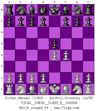 Last move : Re6 2025 December 18 1:14:16 White clock - 95 days 08:18:09 Black clock - 95 days 14:16:26 (59 days 14:00:12) [Event "FICGS__CHESS__CLASS_D__000306"] [Site "FICGS"] [Date "2025.09.17"] [Round "1"] [White "Pintor,Manuel"] [Black "Soretti,Vincenzo"] [Result "*"] [WhiteElo "1783"] [BlackElo "1678"] 1.e4 e5 2.f4 exf4 3.Nf3 d6 4.Bc4 Be6 5.Bxe6 fxe6 6.d4 Nf6 7.Nc3 Be7 8.O-O O-O 9.Ng5 Qd7 10.Bxf4 Nc6 11.d5 exd5 12.exd5 Nd8 13.Qe2 h6 14.Ne6 Nxe6 15.dxe6 Qc6 16.Qd3 d5 17.Be5 Qxe6 18.Rae1 Qf7 19.Bxc7 Bc5+ 20.Kh1 Qxc7 21.Nxd5 Nxd5 22.Qxd5+ Kh8 23.c3 Rxf1+ 24.Rxf1 Rd8 25.Qe4 Bd6 26.g3 Qc6 27.Qxc6 bxc6 28.Kg2 g5 29.Rf6 Kg7 30.Re6 a5 31.a4 h5 32.Kf3 Rf8+ 33.Ke2 Rf6 34.Re4 g4 35.b4 Bc7 36.Re7+ Rf7 37.Re6 * Follow this game move after move (download)Later, I began to succeed in decisive games. Perhaps because I realized a very simple truth: not only was I worried, but also my opponent. (Mikhail Tal) Im Spitzenschach von heute geht es nur um Vorbereitung, um tiefgründige, sorgfältige Eröffnungsvorbereitung. (Nigel Short) No hay precio que no valga la pena por la cabellera del Rey enemigo. (Koblentz) Si rien de grave n'est détecté lors de l'analyse d'une position, on joue alors le coup. Seconde règle de Blumenfeld. If you work for a living, why do you kill yourself working ? (Tuco to a chicken in The Good, The Bad and The Ugly)