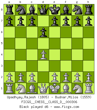 Last move : 0-1 2025 November 8 22:35:55 [Event "FICGS__CHESS__CLASS_D__000306"] [Site "FICGS"] [Date "2025.09.17"] [Round "1"] [White "Upadhyay,Rajesh"] [Black "Budnar,Milos"] [Result "0-1"] [WhiteElo "1805"] [BlackElo "1559"] 1.d4 d6 2.e4 h6 0-1 This chess game has been lost on time (started : 2025.09.17 14:52:51) Follow this game move after move (download)Chess is a terrible game. If you have no center, your opponent has a freer position. If you do have a center, then you really have something to worry about ! (Siegbert Tarrasch) Wie kann ich Remis annehmen? Ich weiß ja gar nicht, wie ich stehe! (Fritz Sämisch) En la perfecta combinación de Ajedrez como en una historia corta de primera clase, toda la trama y contra trama deberá conducir hacia un final sorprendente, el interes no es mitigado hasta el último momento. (Yates and Winter) Le joueur d'Echecs qui veut atteindre le top est obligé de développer son propre credo créatif. Alexeï Stepanovicth Souétine. Il est facile d'écrire des livres ! Ce qui est difficile, c'est de jouer ! (Alexeï Stepanovicth Souétine) It's not the size of the dog in the fight, it's the size of the fight in the dog. (Mark Twain)