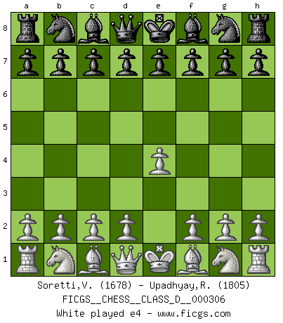 Last move : 1-0 2025 November 8 22:35:55 [Event "FICGS__CHESS__CLASS_D__000306"] [Site "FICGS"] [Date "2025.09.17"] [Round "1"] [White "Soretti,Vincenzo"] [Black "Upadhyay,Rajesh"] [Result "1-0"] [WhiteElo "1678"] [BlackElo "1805"] 1.e4 c5 2.Nf3 Nc6 3.d4 cxd4 4.Nxd4 1-0 This chess game has been lost on time (started : 2025.09.17 14:52:51) Follow this game move after move (download)We must make sure that Chess will not be like a dead language, very interesting, but for a very small group. (Sytze Faber) Früher wurde jeder komplizierte Zug, jedes interessante Opfer mit großem Beifall und Enthusiasmus aufgenommen. Heute schaltet man einfach seinen Fritz an, und man kann sehen, was los ist, ob der Zug geht oder nicht. (Vladimir Kramnik) Aunque la mayoría de la gente disfruta observar las partidas de los grandes Maestros de ataque, algunos de los jugadores mas notables en la historia han sido los jugadores silenciosos posicionales. Lentamente ellos te aplastan despojandote de tu espacio, congestionando tus piezas y dejandote virtualmente sin nada que hacer. (Yasser Seirawan) Les Echecs mettent en conflit, non pas deux intelligences, mais deux volontés. (Lasker) Internal peace cannot coexist with external war. (Don Groves)