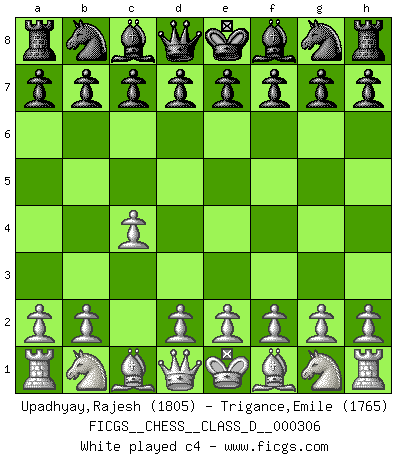 Last move : 1-0 2025 December 8 11:37:50 [Event "FICGS__CHESS__CLASS_D__000306"] [Site "FICGS"] [Date "2025.09.17"] [Round "1"] [White "Upadhyay,Rajesh"] [Black "Trigance,Emile"] [Result "1-0"] [WhiteElo "1805"] [BlackElo "1765"] 1.c4 Nf6 2.Nf3 1-0 This chess game has been lost on time (started : 2025.09.17 14:52:51) Follow this game move after move (download)I have added these principles to the law: get the Knights into action before both Bishops are developed. (Emanuel Lasker) Die Leute spielen gegen mich seit 15 Jahren unter Ihren Möglichkeiten. (Robert James Fischer) La última cosa en que Fischer estaba interesado era en tonterías, siempre y cuando el Ajedrez estuviera involucrado. (Elie Agur) Même si vous avez un bon coup à faire, regardez toujours s'il n'y en a pas un qui lui soit préférable. (Pedro Damiano) If only people were all showed a certain minimum level of niceness; if only people didn't retract verbal draw offers (without draw box ticked) on ficgs; if only people didn't kill; if only people didn't run concentration / extermination camps, if only people didn't drop nuclear bombs on Hiroshima and Nagasaki, and so on - it would be a much more beautiful world. But sadly, things are not so... (Normajean Yates)
