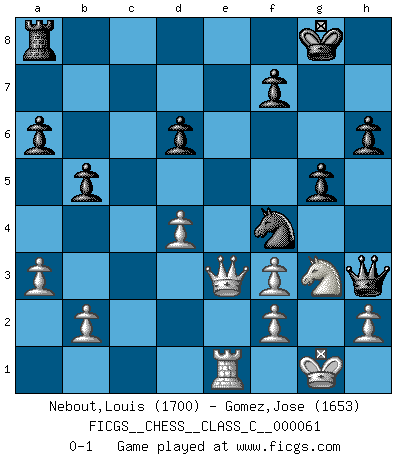 Last move : 0-1 2007 December 10 19:1:53 [Event "FICGS__CHESS__CLASS_C__000061"] [Site "FICGS"] [Date "2007.10.07"] [Round "1"] [White "Nebout,Louis"] [Black "Gomez,Jose"] [Result "0-1"] [WhiteElo "1700"] [BlackElo "1653"] 1.e4 e5 2.Nf3 Nc6 3.Bb5 a6 4.Ba4 Nf6 5.O-O b5 6.Bb3 Bb7 7.c3 Bd6 8.Re1 O-O 9.d4 h6 10.Bc2 Re8 11.Nbd2 Qc8 12.Nf1 exd4 13.cxd4 Nb4 14.e5 Bxf3 15.gxf3 Nxc2 16.Qxc2 Bb4 17.Bd2 Bxd2 18.Qxd2 Nd5 19.Ng3 d6 20.exd6 cxd6 21.Rxe8+ Qxe8 22.Re1 Qd8 23.a3 Qf6 24.Kg2 Nf4+ 25.Kf1 Qh4 26.Kg1 g5 27.Qe3 Qh3 0-1 Ruy Lopez : Archangelsk (counterthrust) variation Kingside Castling by player White (move 5) Kingside Castling by player Black (move 8) Player Black won this chess game. Follow this game move after move (download)Mistrust is the most necessary characteristic of the Chess player. (Siegbert Tarrasch) Wenn Dein Gegner dir ein Remis anbietet, versuch herauszufinden, weshalb er glaubt schlechter zu stehen. (Nigel Short) Tu eres para mi la Reina en d8 y yo soy el Peón en d7!!. (GM Eduard Gufeld) A ce moment-là, je menaçais de comprendre la position ! (Clément L'Heureux) Watch your thoughts; they become words. Watch your words; they become actions. Watch your actions; they become habits. Watch your habits; they become character. Watch your character; it becomes your destiny. (Frank Outlaw)