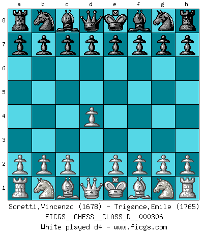 Last move : 1-0 2025 November 16 0:54:25 [Event "FICGS__CHESS__CLASS_D__000306"] [Site "FICGS"] [Date "2025.09.17"] [Round "1"] [White "Soretti,Vincenzo"] [Black "Trigance,Emile"] [Result "1-0"] [WhiteElo "1678"] [BlackElo "1765"] 1.d4 Nf6 2.c4 g6 3.Nc3 d5 4.e3 Bg7 5.Nf3 O-O 6.Be2 c6 7.O-O 1-0 This chess game has been lost on time (started : 2025.09.17 14:52:51) Follow this game move after move (download)The King is a fighting piece. Use it ! (Wilhelm Steinitz) Kombinieren und Schwarzhandel gehören verboten. (Savielly Grigorievitsch Tartakower) Si tu oponente te ofrece un empate, trata de averiguar porque piensa él que esta en una posición peor. (Nigel Short) Dieu déplace le joueur, et celui-ci la pièce. Quel Dieu derrière Dieu commence donc la trame ? Arturo Perez-Reverte (prix de littérature policière 1993). First of all, we have to go back to the classical time control. (Anatoly Karpov)