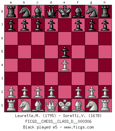 Last move : 0-1 2025 November 7 19:2:41 [Event "FICGS__CHESS__CLASS_D__000306"] [Site "FICGS"] [Date "2025.09.17"] [Round "1"] [White "Leurette,Marc-Antoine"] [Black "Soretti,Vincenzo"] [Result "0-1"] [WhiteElo "1795"] [BlackElo "1678"] 1.e4 e5 2.Nf3 Nc6 3.Bc4 Nf6 4.Ng5 d5 5.exd5 Nxd5 6.d3 Na5 7.Qf3 Be6 8.Nxe6 fxe6 9.Bb5+ c6 10.Bd2 cxb5 11.O-O Nc6 12.Nc3 Nd4 13.Qh5+ Kd7 14.Qxe5 Qf6 15.Qxf6 Nxf6 16.Rac1 b4 17.Na4 Ne2+ 18.Kh1 Nxc1 19.Rxc1 b5 20.Nc5+ Bxc5 21.f3 a5 0-1 Follow this game move after move (download)Nowadays, when you're not a grandmaster at 14, you can forget about it. (Anand Viswanathan) Dieses schreckliche Gefühl, dass ich gegen eine Maschine spielte, die niemals Fehler macht, zerschmetterte meinen Widerstand. (Mark Taimanov) Evita las multitudes. Haz independientemente tu propio razonamiento. Trata de ser el jugador de Ajedrez, no la pieza de Ajedrez. (Ralph Charell) Celui qui prend des risques peut perdre, celui qui n'en prend pas perd toujours. (Xavier Tartacover) The beginning of wisdom is silence. The second step is listening. (Unknown)