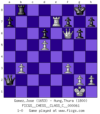 Last move : 1-0 2008 January 22 23:37:4 [Event "FICGS__CHESS__CLASS_C__000061"] [Site "FICGS"] [Date "2007.10.07"] [Round "1"] [White "Gomez,Jose"] [Black "Aung,Thura"] [Result "1-0"] [WhiteElo "1653"] [BlackElo "1800"] 1.e4 c5 2.Nc3 d6 3.Nf3 Nc6 4.d4 cxd4 5.Nxd4 Nf6 6.Be3 Ng4 7.Bb5 Bd7 8.O-O g6 9.Nxc6 bxc6 10.Bxc6 Bxc6 11.Qxg4 Bg7 12.Qe2 O-O 13.Qd3 Rc8 14.Bd4 Bxd4 15.Qxd4 Qa5 16.Rfe1 Rc7 17.f3 Rb8 18.b3 Bb7 19.Nd5 Bxd5 20.exd5 Rxc2 21.Rxe7 Rxa2 22.Rxa2 Qxa2 23.Qf6 1-0 Sicilian : Closed Kingside Castling by player White (move 8) Kingside Castling by player Black (move 12) Player White won this chess game. Follow this game move after move (download)For surely of all the drugs in the world, Chess must be the most permanently pleasurable. (Assiac) Schach sollte überall auf der Welt Schulfach werden. Es fördert die geistige Auseinandersetzung. Es lehrt die Demut in der Niederlage. (Garry Kasparov) Yo jugué Ajedrez con el y a veces le pude haber ganado solo que siempre devuelve su última jugada y juega la partida de manera diferente. (Mark Twain) Plusieurs personnes se sont demandées comment Tal faisait pour gagner... En fait, c'est très simple ! Il met ses pièces au centre de l'échiquier et les sacrifie quelque part ! (David Bronstein) Memory is a complicated thing, a relative to truth, but not its twin. (Barbara Kingsolver, Animal Dreams)